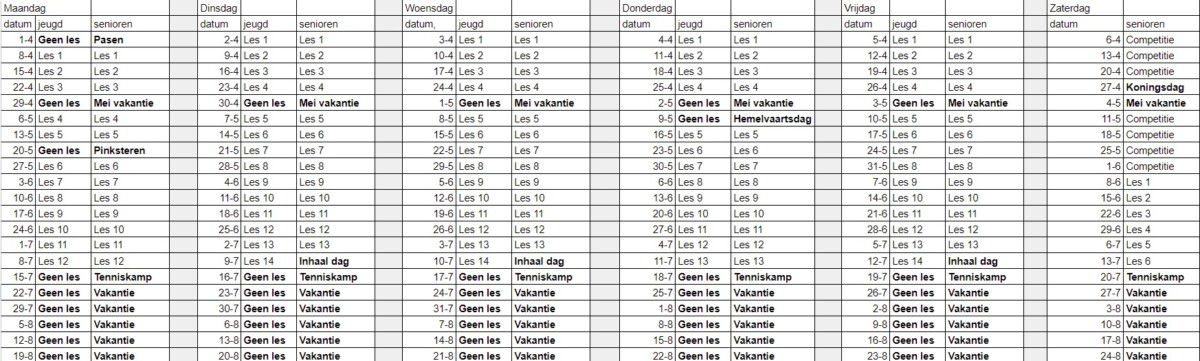 Indeling tennislessen Maandag