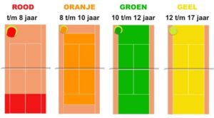 Wij werken met het Tenniskids systeem. Het Tenniskids-systeem is een jeugdprogramma van de KNLTB (Koninklijke Nederlandse Lawn Tennisbond) dat is ontworpen om kinderen op een speelse manier kennis te laten maken met tennis. Het systeem maakt gebruik van verschillende kleuren om de niveaus van de kinderen aan te geven. Het doel is om kinderen in staat te stellen om sneller te leren en plezier te hebben, afhankelijk van hun ontwikkeling. Hieronder het overzicht van het Tenniskids-systeem: